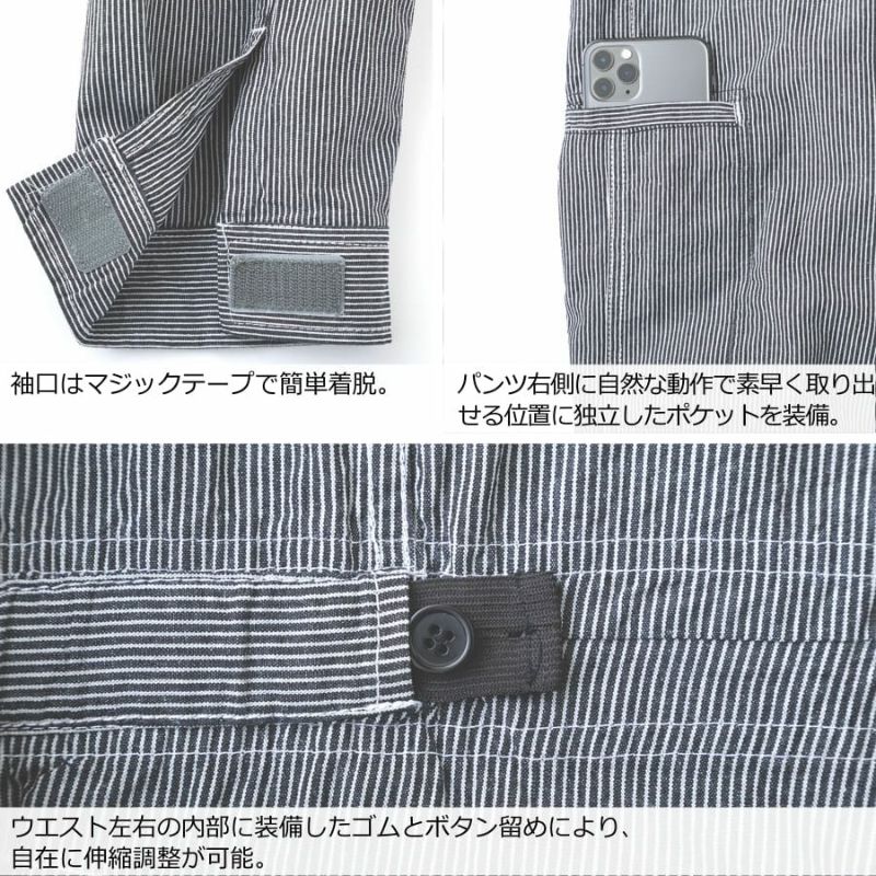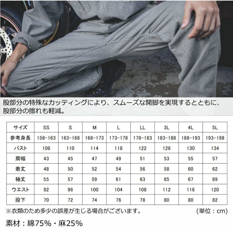 綿×麻の天然素材のみを使用した、サラリと快適な薄生地ツナギ。 人と被りにくいヒッコリー(細いストライプ)柄がオシャレ。