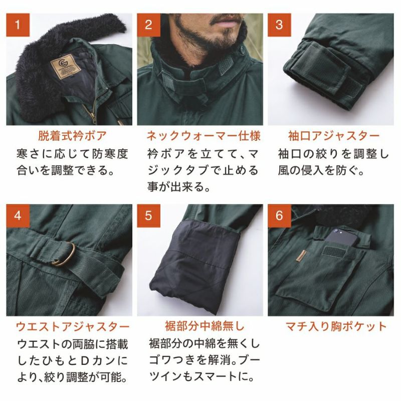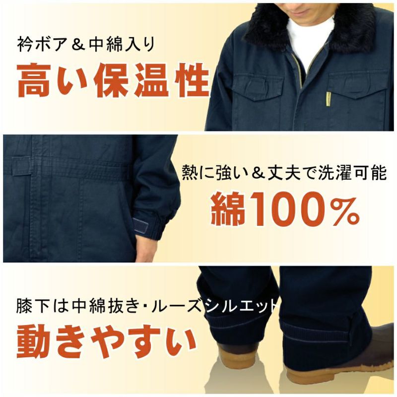 中綿と衿ボアで保温性が高く、綿100%なので溶接などの高温作業にもおすすめです。