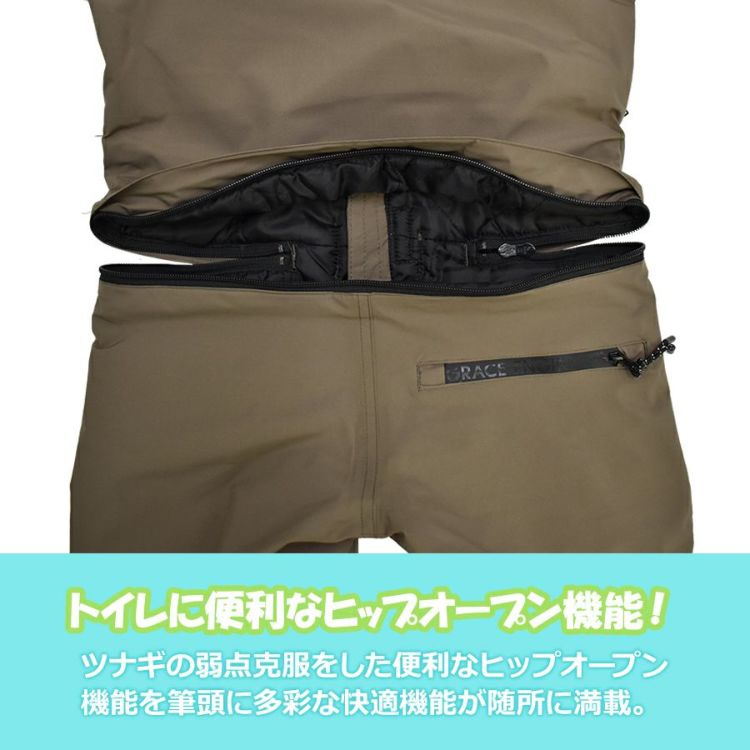 トイレがしにくいというツナギの弱点克服をした便利なヒップオープン機能を筆頭に、多彩な快適機能が満載です。