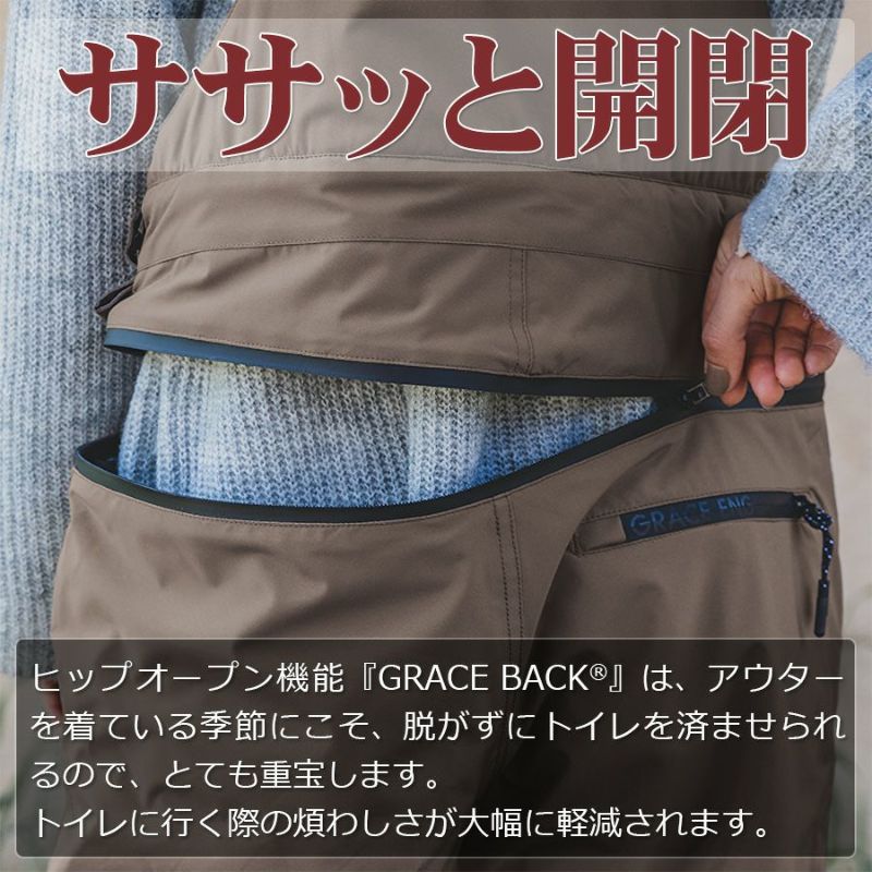 特に注目すべきは、脱がずに用を足せる画期的なヒップオープン機能『GRACE BACK』。 厳しい寒さの中、キャンプや釣り、バイクなど冬の必携アイテムとしてぜひお試しください。
