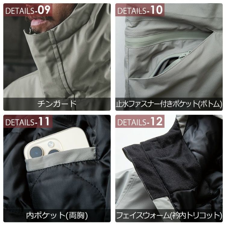 防風性と防水性に優れた耐水圧15,000mm、透湿度5,000g/㎡・24hを誇るハイスペックな生地に、キルティング中綿を採用し、抜群の保温性を実現しました。