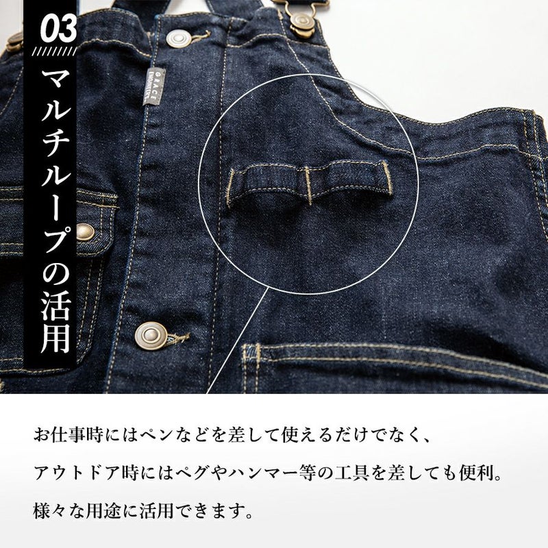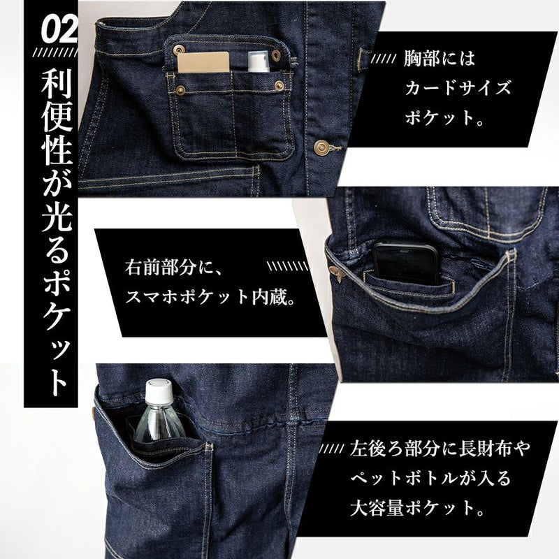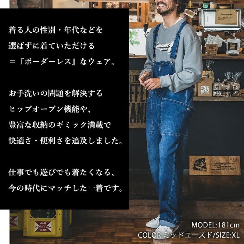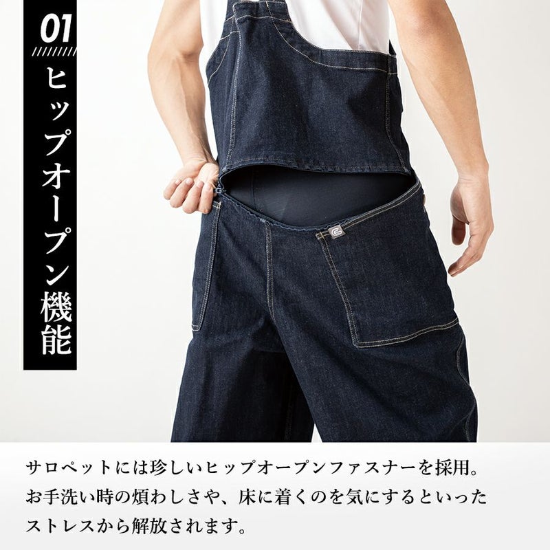 サロペットには珍しいヒップオープン機能をはじめ、大容量ポケット、スマホポケットや長財布ポケット、カードポケット、ペンや工具を差せるマルチループなど、便利なギミック満載の一着です。