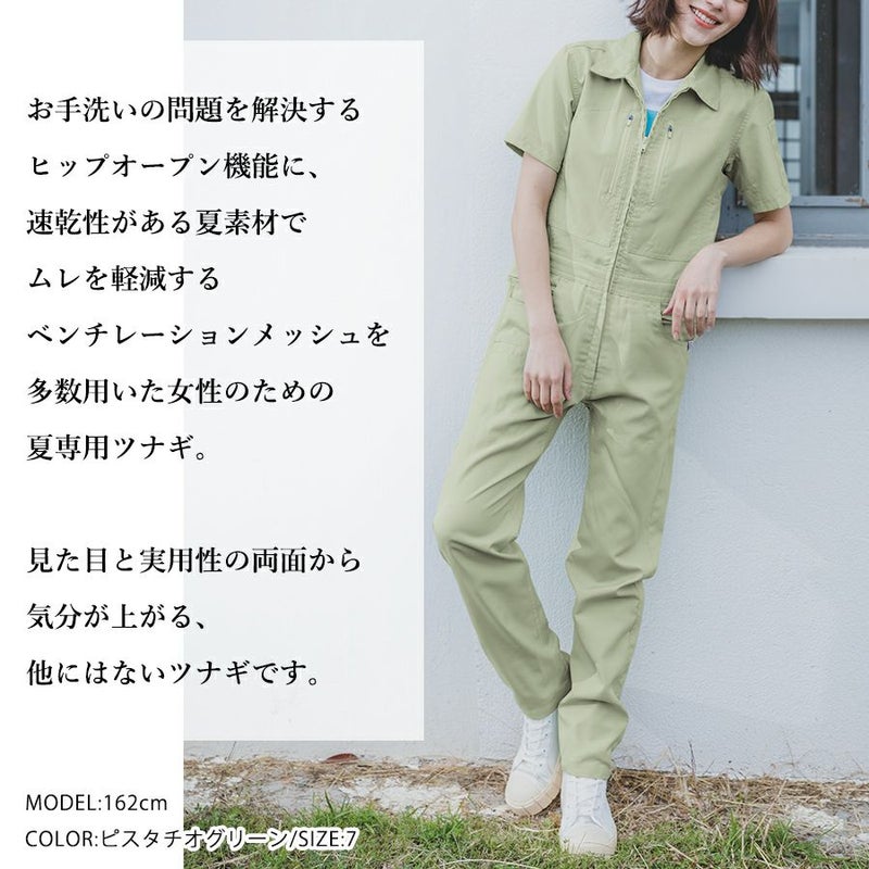 速乾性がある夏素材でムレを軽減する、ベンチレーションメッシュを多数用いた女性のための夏専用ツナギ。