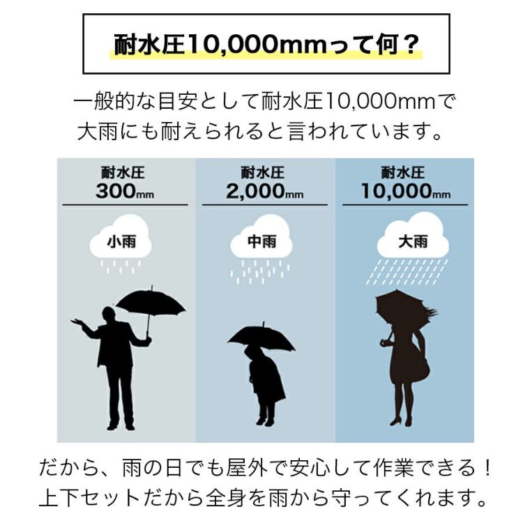 上下セットで雨の日の作業・通勤・バイク乗車にも安心して使えます。