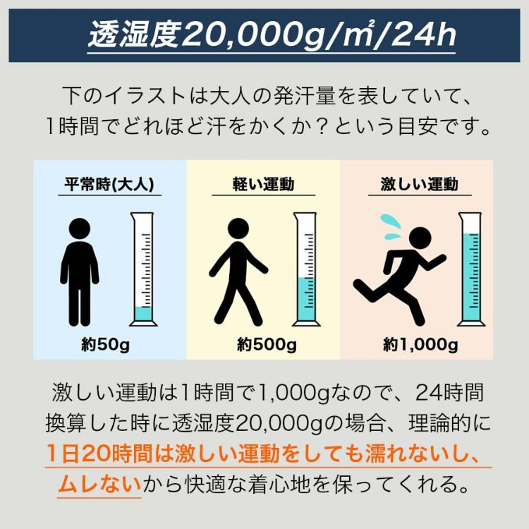 ■不快な蒸れを逃がす高い透湿性(透湿度20,000g/m2・24h)