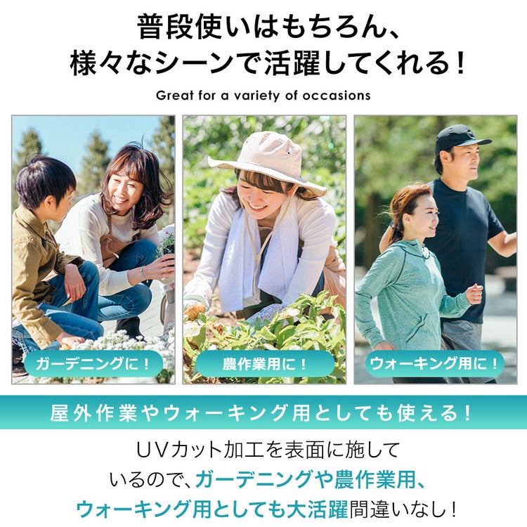 ガーデニングや農作業・家庭菜園などの屋外作業用としてはもちろん、ウォーキングやジョギングなどの運動時のちょっとした羽織りアイテムとしてもおすすめになります。