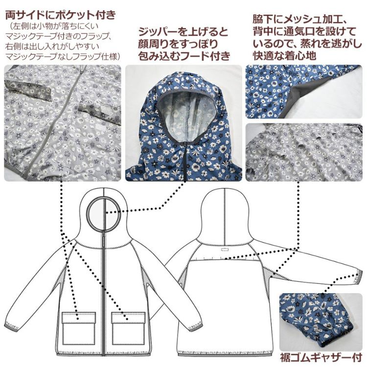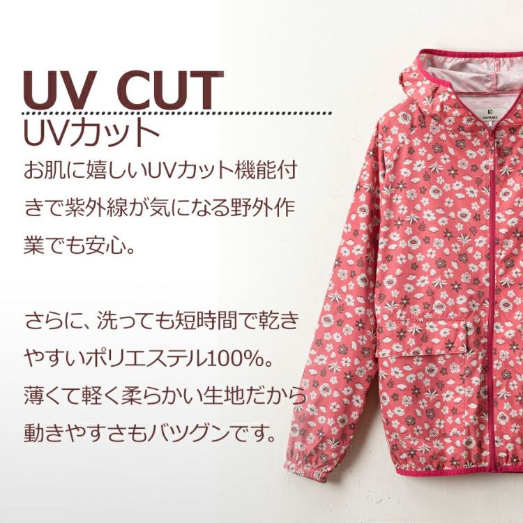 撥水加工で急な雨や水しぶきにも対応でき、更に日差しからお肌を守るUVカット加工を施した多機能ヤッケパーカーです。
