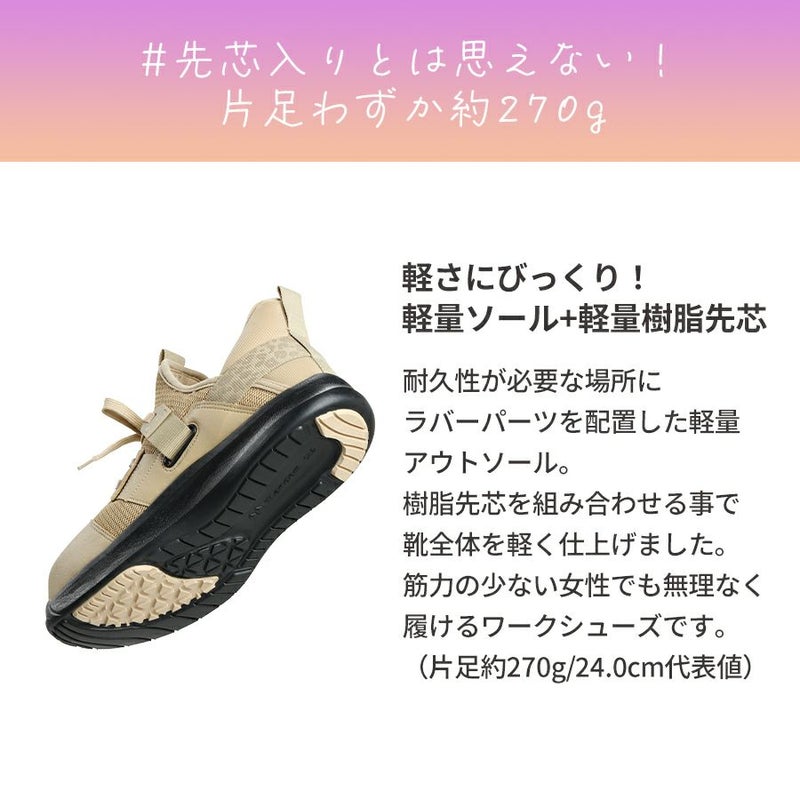 #先芯入りとは思えない!片足わずか約270g 軽さにびっくり!軽量ソール+軽量樹脂先芯 耐久性が必要な場所にラバーパーツを配置した軽量アウトソール。樹脂先芯を組み合わせる事で靴全体を軽く仕上げました。筋力の少ない女性でも無理なく履けるワークシューズです。(片足約270g/24.0cm代表値)