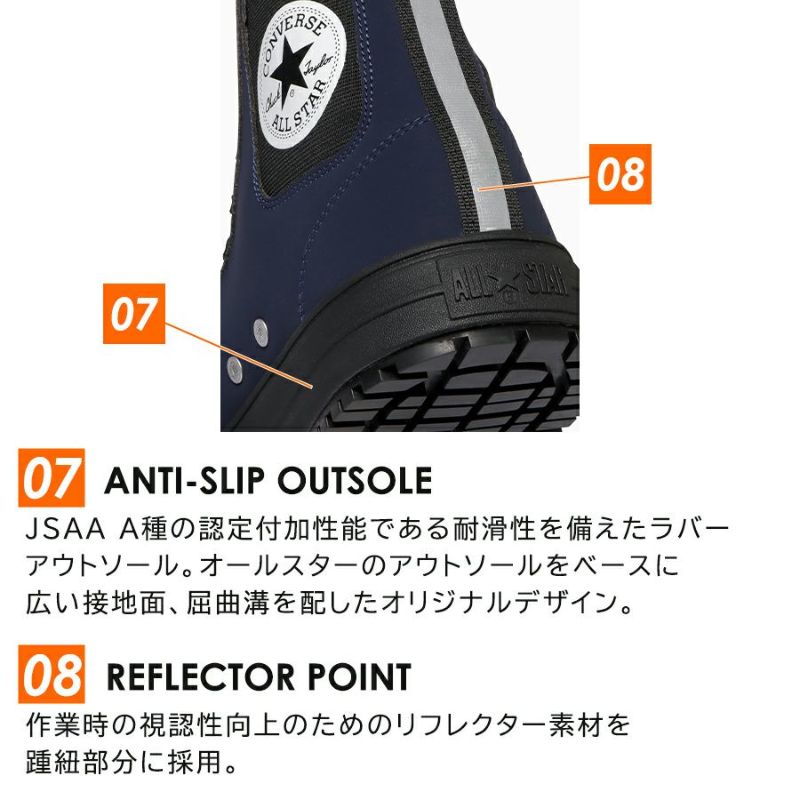 ⑦ANTI-SLIP OUTSOLE JSAA A種の認定付加性能である耐滑性を備えたラバーアウトソール。オールスターのアウトソールをベースに広い接地面、屈曲溝を配したオリジナルデザイン。 ⑧REFLECTOR POINT 作業時の視認性向上のためのリフレクター素材を踵紐部分に採用。