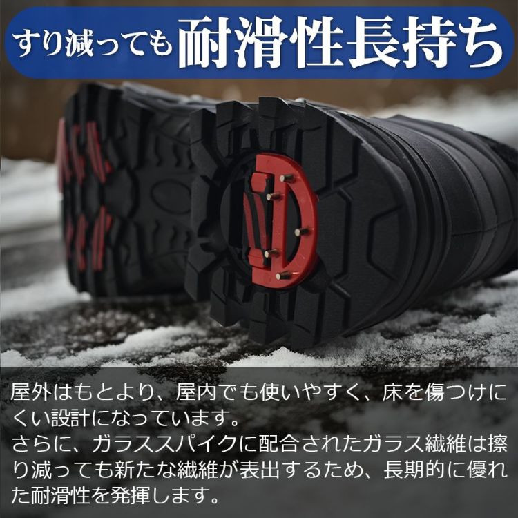 丈夫で錆びにくいステンレス製のスパイクピンが、雪や氷の表面に食い込むことで、滑りやすい路面でも安定した歩行をサポートします。