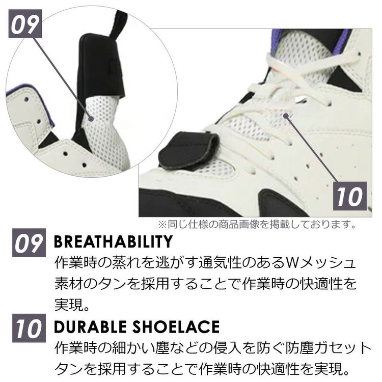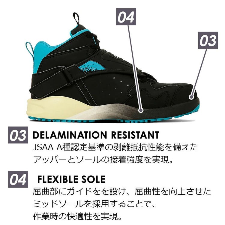 JSAA規格が定める、つま先部の耐衝撃性や耐圧迫性、表底の剥離抵抗、耐滑性、踵部の衝撃吸収性などの性能に加え、 作業において必要となるクッション性や、屈曲溝を内部に施した軽量な圧縮E.V.A.素材をミッドソールに採用することで歩行時の屈曲性を向上。
