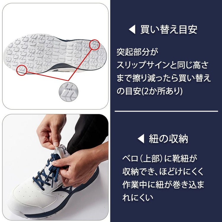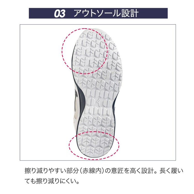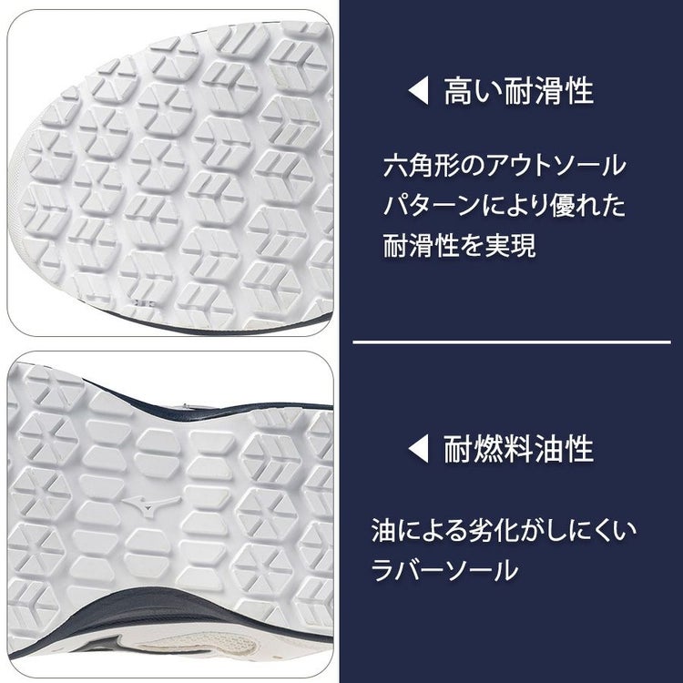 ■Mizuno Enerzyをミッドソール全面に搭載し、優れたクッション性と反発性を実現。クッション性が前モデル※の約123%に向上。 1日働くワーカーの快適をサポート。※ALMIGHTY LSⅡ