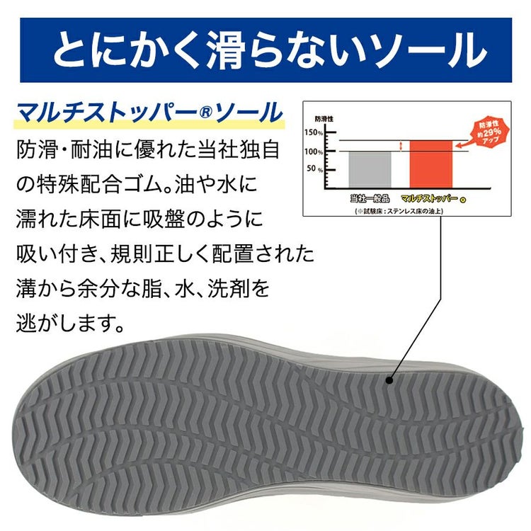 安全かつ靴へのダメージを軽減する設計。ソールには、独自の意匠と特殊ラバーを用いたマルチストッパー(R)ソールを採用。