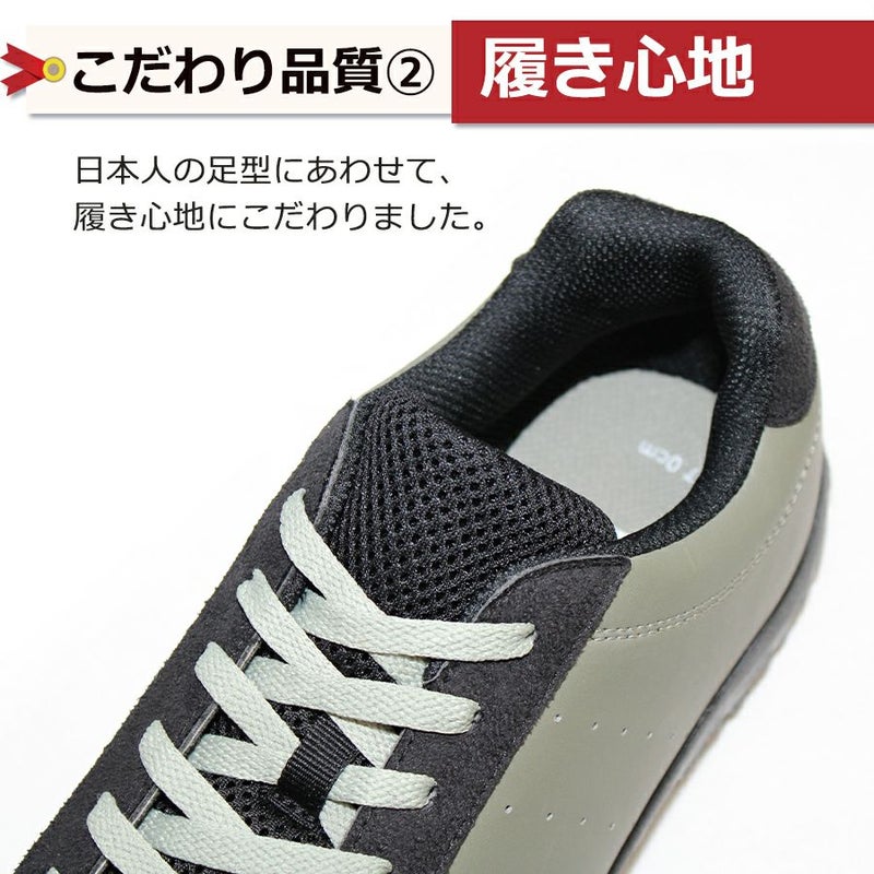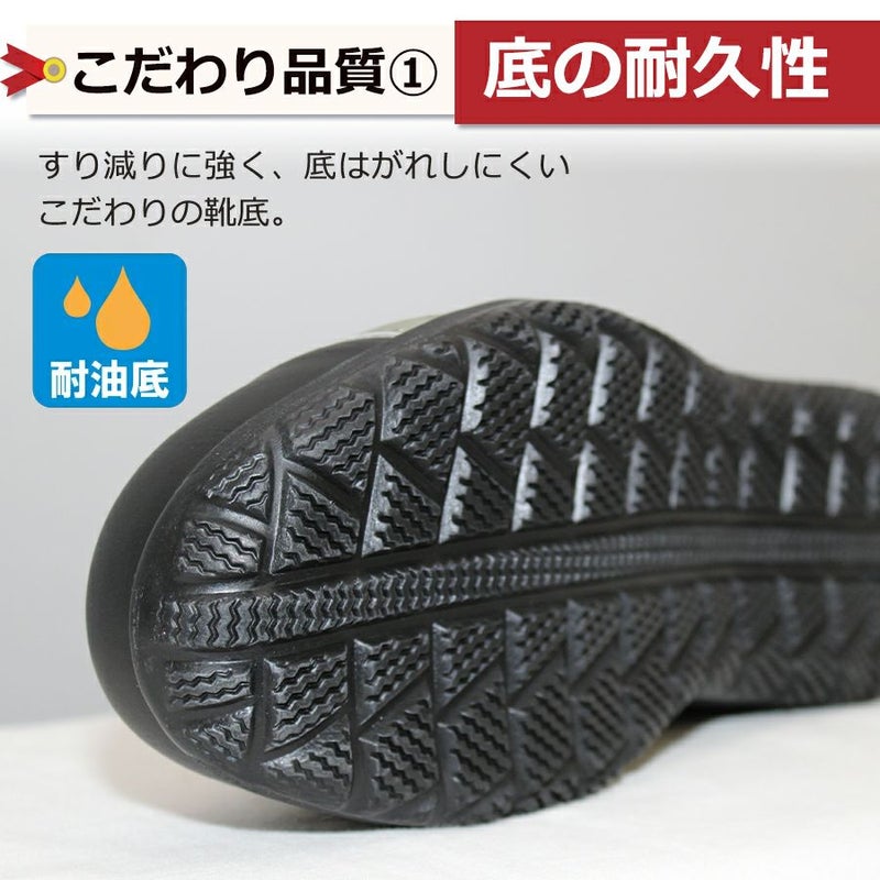ガソリンスタンドなどでも靴底が劣化しにくく安心して使える「耐油底」、すり減りに強く底剥がれしにくい丈夫な靴底、つま先を守る鋼鉄先芯入り、安心のJSAA(公益社団法人 日本保安用品協会) A種(普通作業用)認定のプロテクティブスニーカー(安全スニーカー)