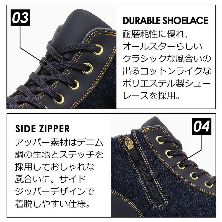 外腰にジッパーを配した脱ぎ履きしやすい仕様でデニム素材をアッパーに採用しました。 アンクルパッチやハトメパーツ、ステッチなどもデニムで見られるカラーを取り入れたこだわりのデザインになります。 インディゴ、ブラックの2カラー展開です。