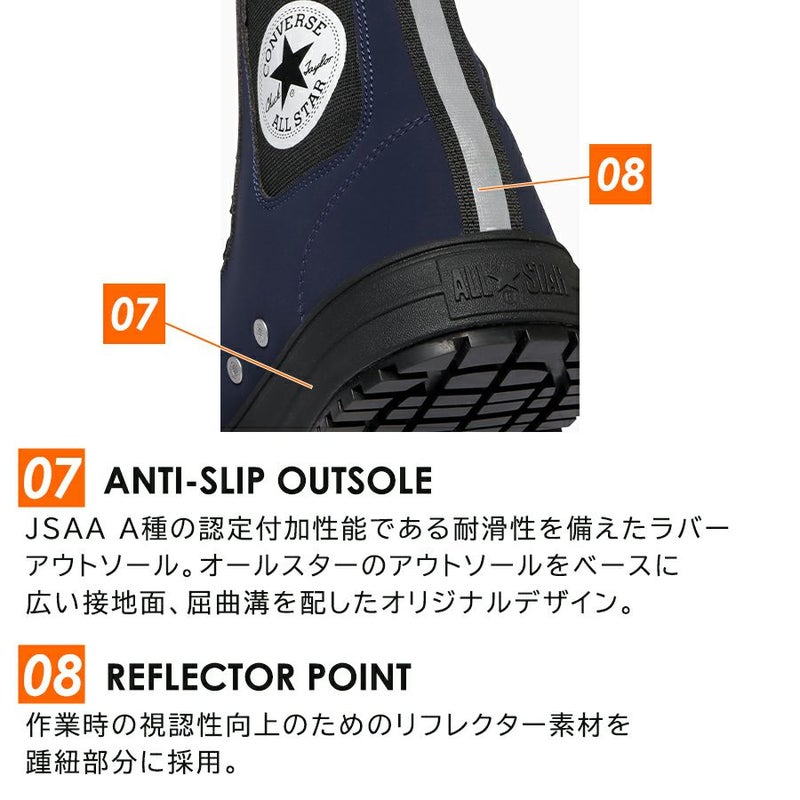 ⑦ANTI-SLIP OUTSOLE JSAA A種の認定付加性能である耐滑性を備えたラバーアウトソール。オールスターのアウトソールをベースに広い接地面、屈曲溝を配したオリジナルデザイン。 ⑧REFLECTOR POINT 作業時の視認性向上のためのリフレクター素材を踵紐部分に採用。
