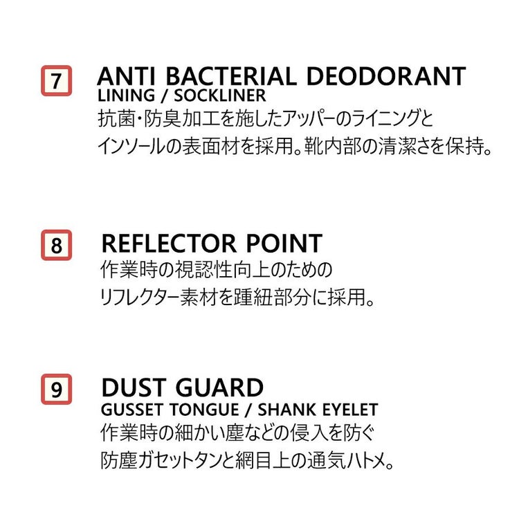 踵紐にリフレクターを配し、作業時の安全性を高めるデザインとなっています。