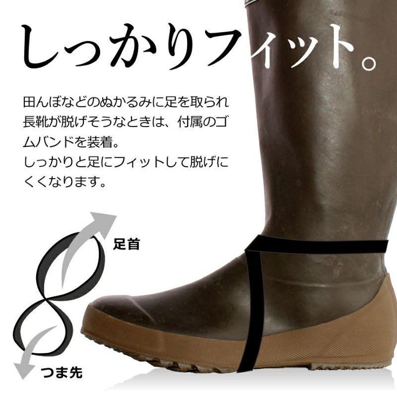 また、付属のゴムバンドで足首部分を固定すれば、田んぼのぬかるみでも脱げにくくなるので田植えなどにもおススメです。