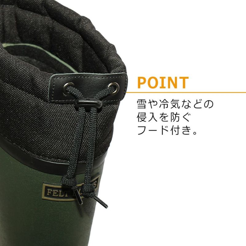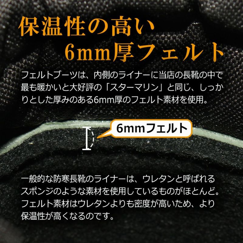 ライナーに極厚6mmフェルト素材を使用した保温性の高い防寒長靴。