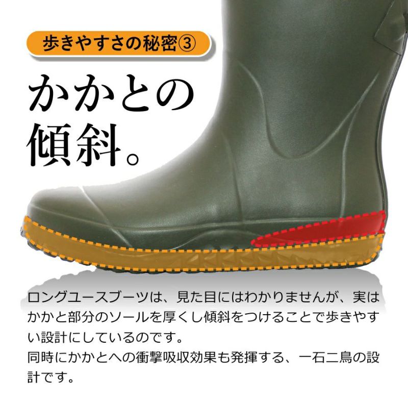 足首フィット、かかとの傾斜で歩きやすさを追求した長靴。