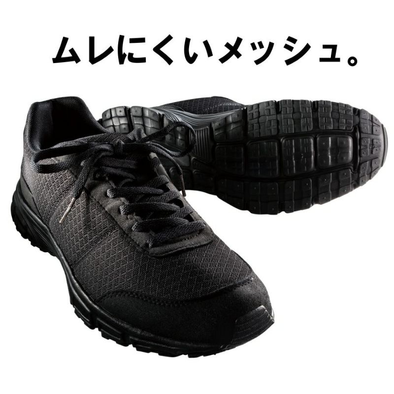 ソールからヒモまで、すべてが真っ黒なスニーカー。ムレにくいメッシュ仕立てにホールド感のあるカカト、履いた感じはいたって軽や か。
