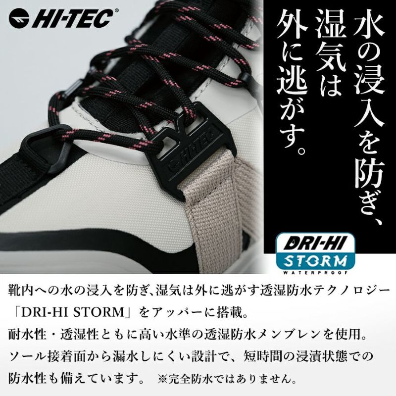 アッパーには高グレードの透湿防水メンブレンを使用した「DRI-HI STORM」を搭載し、耐水圧(10,000mm)/ 透湿度(5,000g/m2/24hr)の性能を誇ります。