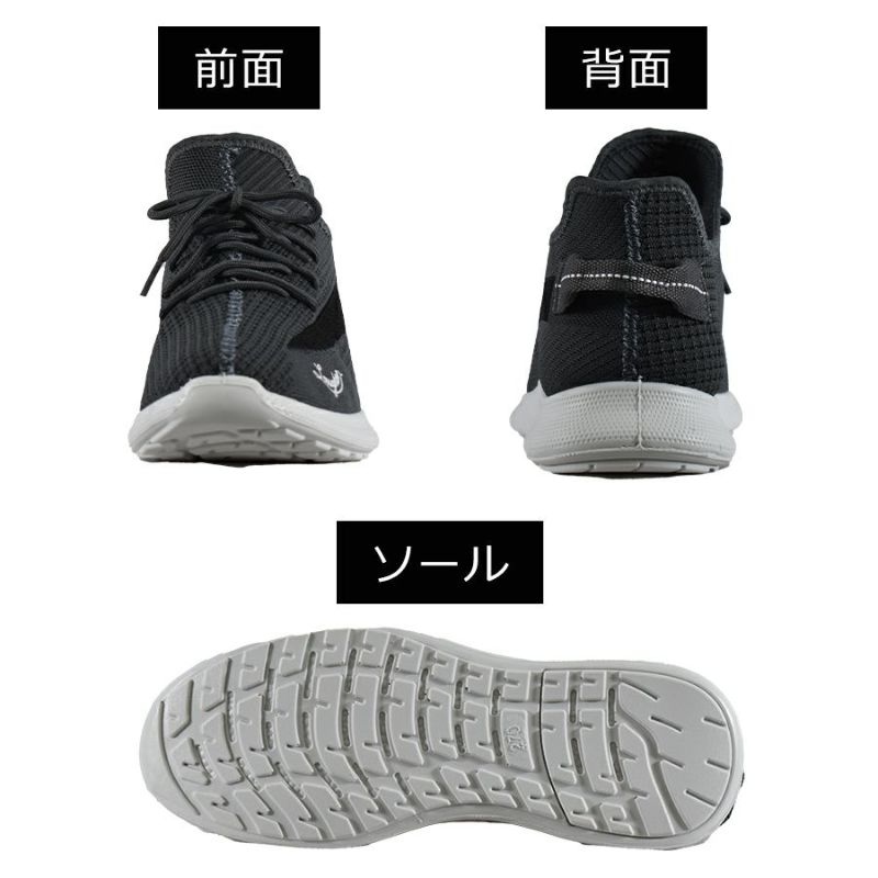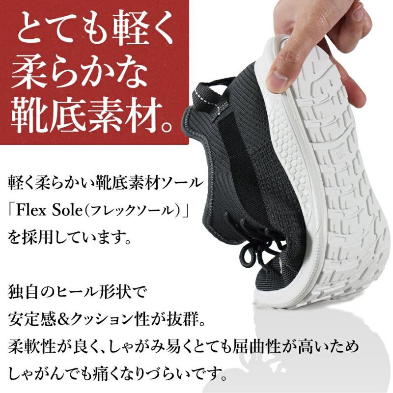アッパー部に丈夫なニット素材を採用し、縫製部が少なく破け摩耗に強く、伸縮性があり適度なホールド感が特長。