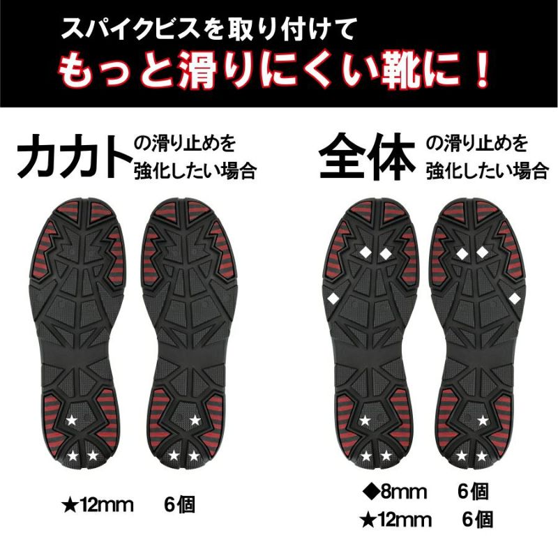 スパイクビスを取り付けてもっと滑りにくい靴に! カカトの滑り止めを強化したい場合 12mm 6個 全体の滑り止めを強化したい場合 8mm6個 12mm6個