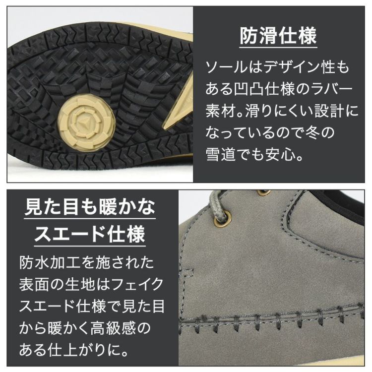 見た目も暖かなスエード調素材を使用しているので、女性も安心して履けるデザイン性の高さもポイントです。