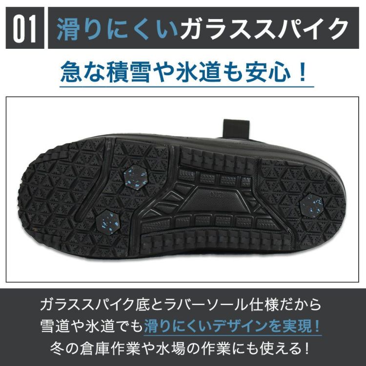 ガラススパイク底とラバーソール仕様だから 雪道や氷道でも滑りにくいデザインを実現! 冬の倉庫作業や水場の作業にも使える!