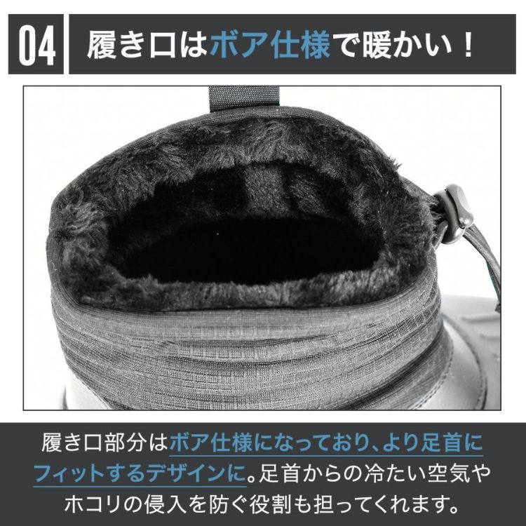 履き口部分はボア仕様になっており、より足首に フィットするデザインに。足首からの冷気、雨や雪の侵入を防ぐ役割も担ってくれます。