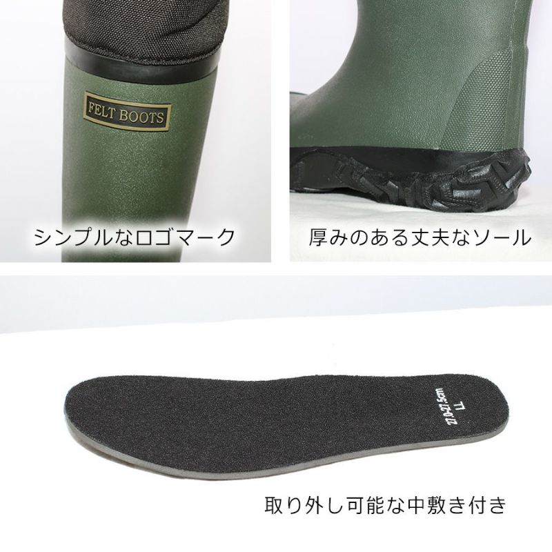ライナーに極厚6mmフェルト素材を使用した保温性の高い防寒長靴。