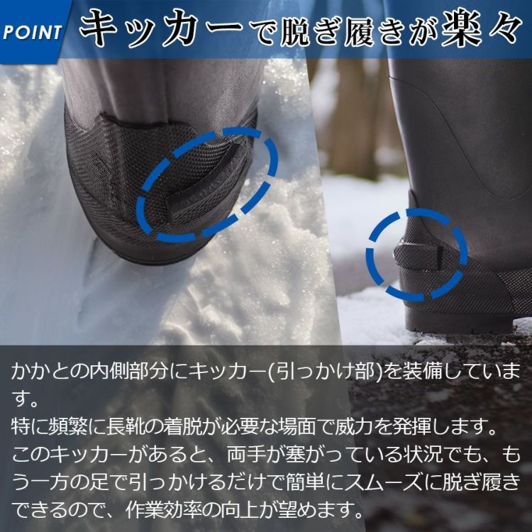 かかとの内側部分にキッカー(引っかけ部)を装備しています。特に頻繁に長靴の着脱が必要な場面で威力を発揮します。