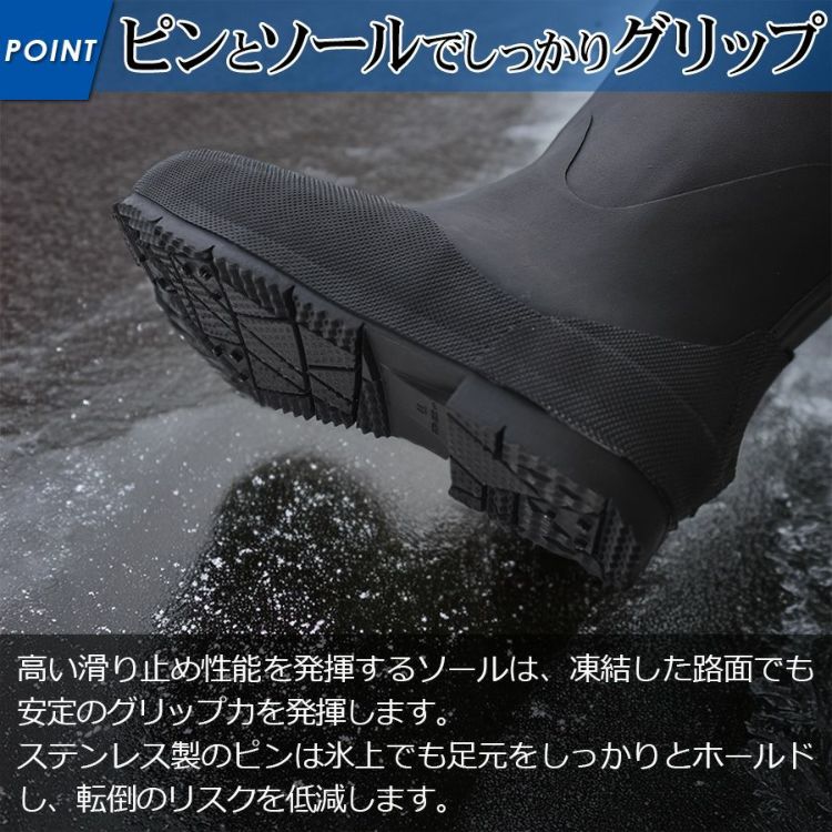 高い滑り止め性能を発揮するソールは、凍結した路面でも安定のグリップ力を発揮します。ステンレス製のピンは氷上でも足元をしっかりとホールドし、転倒のリスクを低減します。