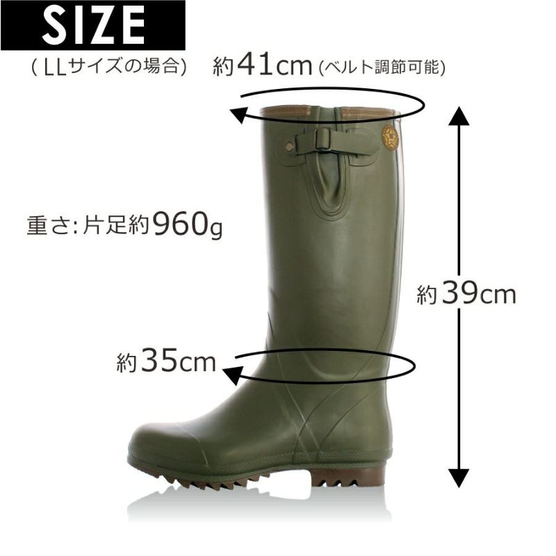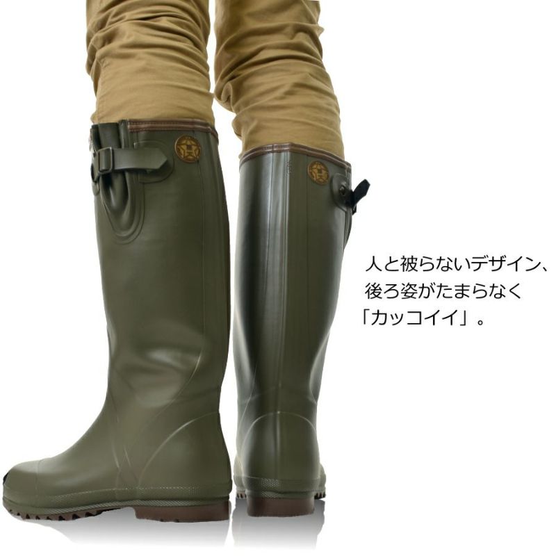 中でもこの「フィールドブーツ」は、シンプルなデザイン&カラーながら、人と被らず個性が光るオシャレな長靴。溝が深く粘り気のある滑りにくい靴底(リップル底)と、ブーツのようなサイドベルトで履き口の調整が可能です。