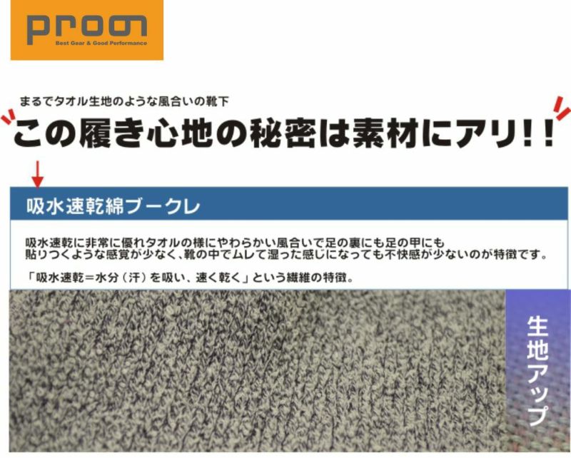 まるでタオルのような肌触りで、汗吸いの良い「ブークレ」素材は快適な履き心地。