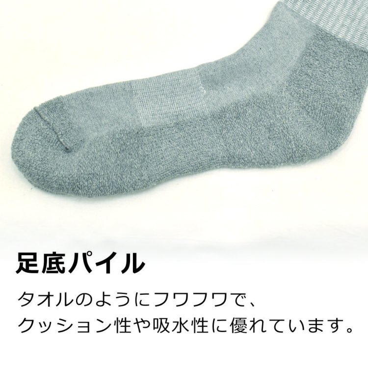 吸汗・耐久性に優れ、底はふかふかパイルのロングセラー靴下のレギュラー丈タイプ。