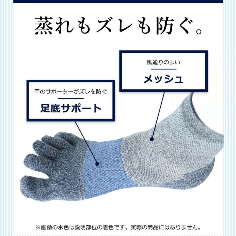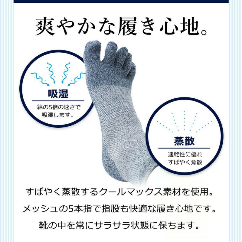 メッシュの5本指で指股も快適、靴の中を常にサラサラ状態に保つのも嬉しいポイントです。
