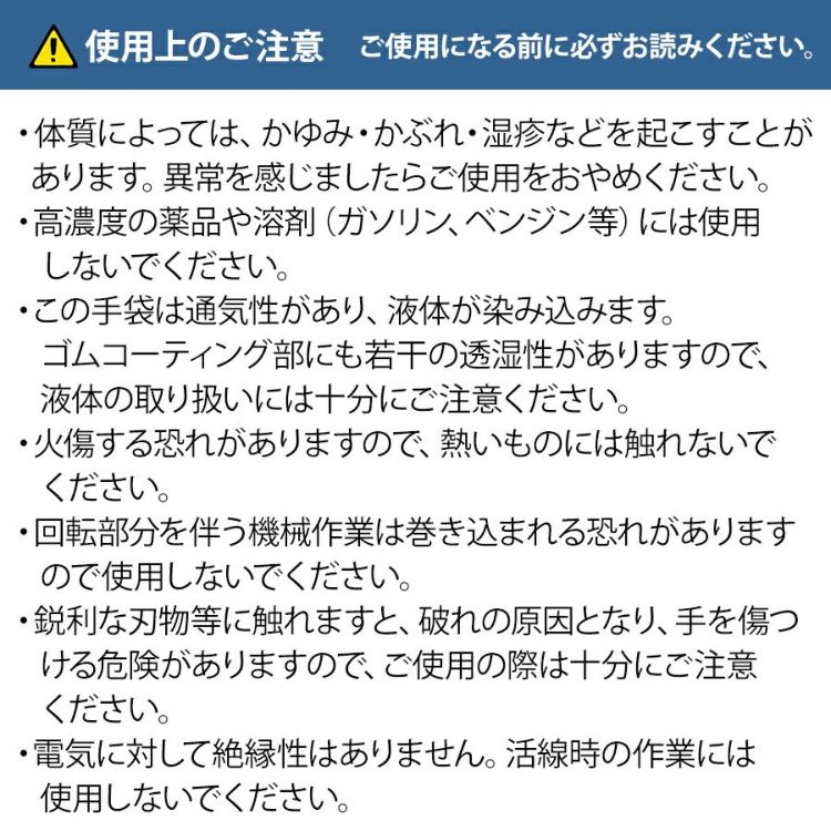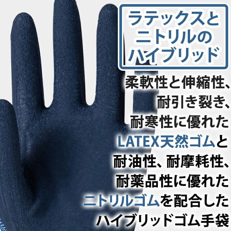 柔軟性と伸縮性、耐引き裂き、耐寒性に優れたLATEX天然ゴムと耐油性、耐摩耗性、耐薬品性に優れたニトリルゴムを配合しフィット感と耐久性の両方を実現。