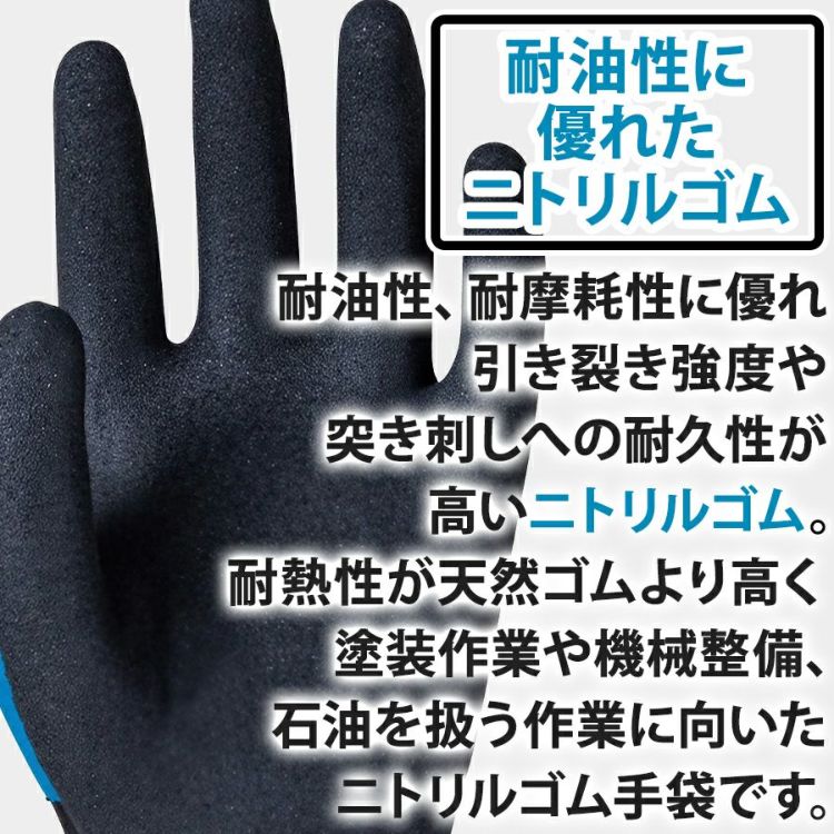 ★耐油性、耐摩耗性に優れ引き裂き強度や突き刺しへの耐久性が高い、ニトリルゴム使用のゴム手袋。