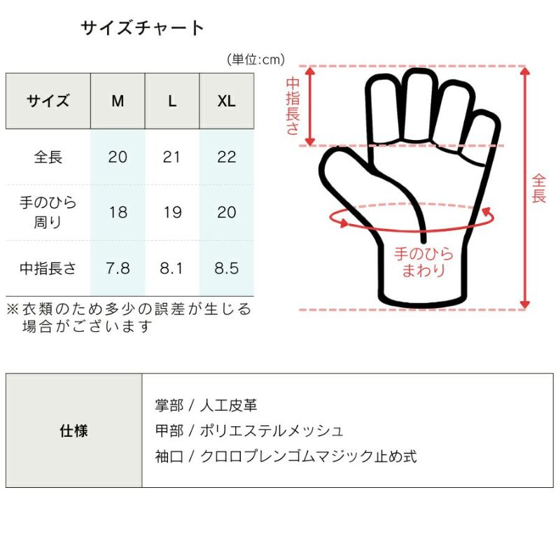 掌部 / 人工皮革 、甲部 / ポリエステルメッシュ 、袖口 / クロロプレンゴムマジック止め式