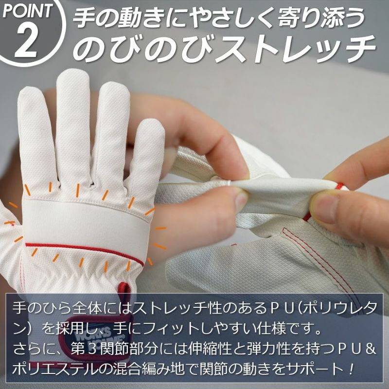 手のひら全体にはストレッチ性のあるPU(ポリウレタン)を採用し、手にフィットしやすい仕様です。