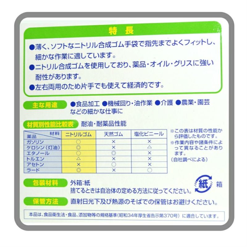 ビニールやラバーディスポが有名ですが、二トリルディスポもオススメです!! ビニールやラバーと比較し薬品や突き刺しに強い特徴があります。 またラバーと違い、アレルギーなどもおきづらい素材です。 食品加工から機械作業、介護や園芸など、幅広い用途でご利用できますが、 お子様が病気になったときの汚物の処理作業や髪染め時など、 一家に一箱あると、とても便利な使い捨て手袋です。 ちなみに野菜を切ったりする際に使用する場合は、 包丁で切ってしまって混入しても判明しやすいブルーがオススメです。