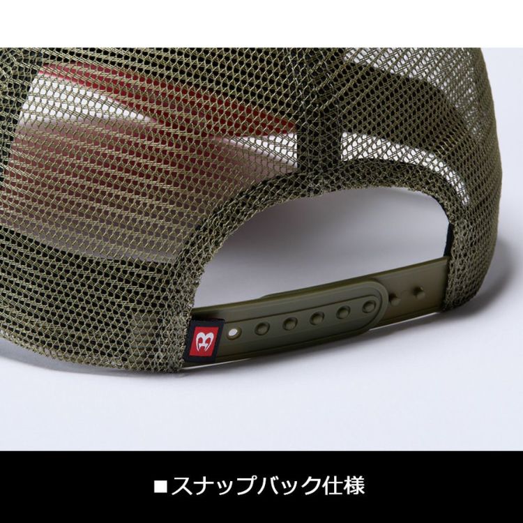 バートルエンブレムを施した通気性が高く快適なメッシュキャップ。サイズ調整が可能なスナップバック仕様でユニセックスの着用に対応しています。