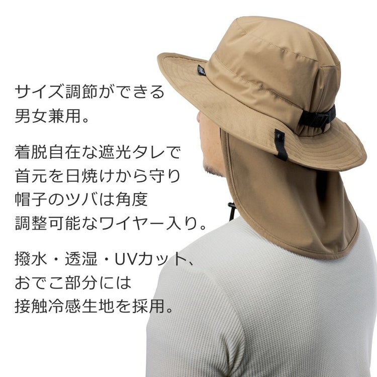 着脱自在な遮光タレで首元を日焼けから守り、帽子のツバは角度調整可能なワイヤー入り。