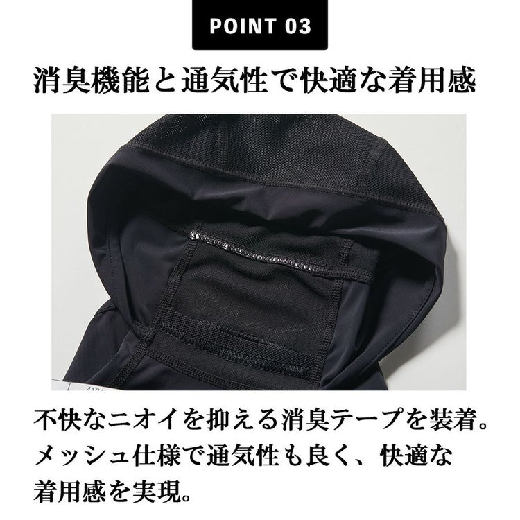 バラクラバに欠かせないUVカット機能(UPF45)や暑さの中の着用に重宝する吸汗速乾加工機能付き!