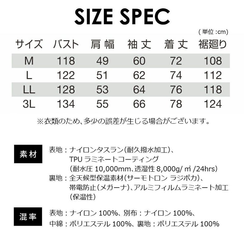 裏地:全天候型保温素材(サーモトロン ラジポカ)、帯電防止(メガーナ)、アルミフィルムラミネート加工(保温性)