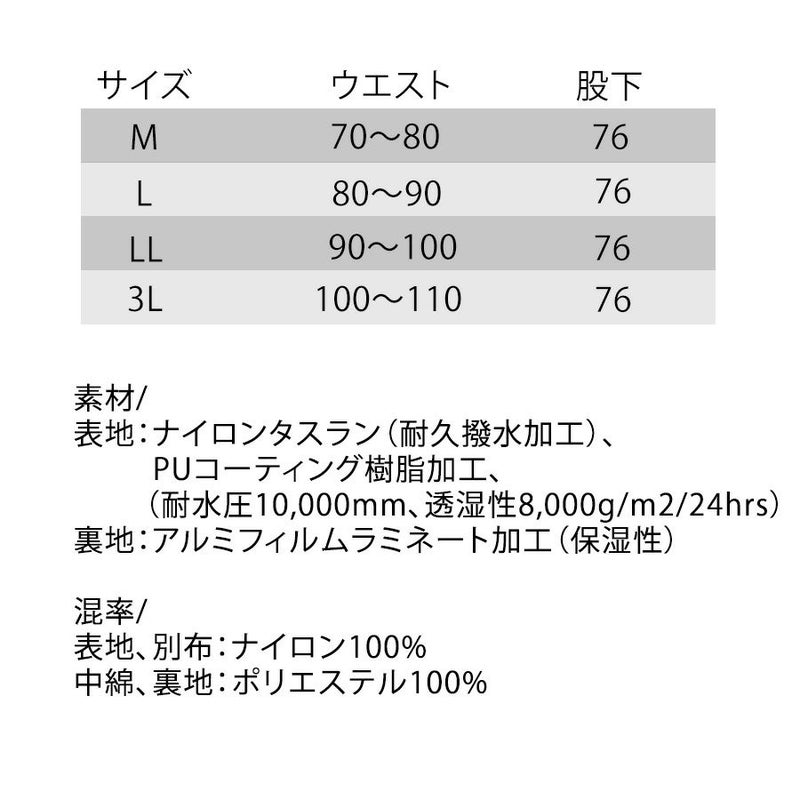 表地:ナイロンタスラン(耐久撥水加工)、PUコーティング樹脂加工(耐水圧10,000mm、透湿性8,000g/m2/24hrs)