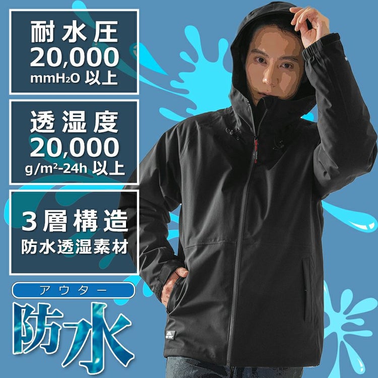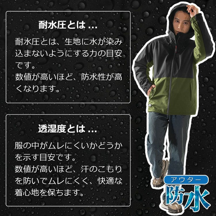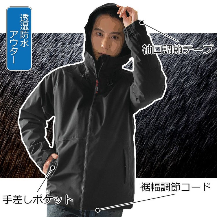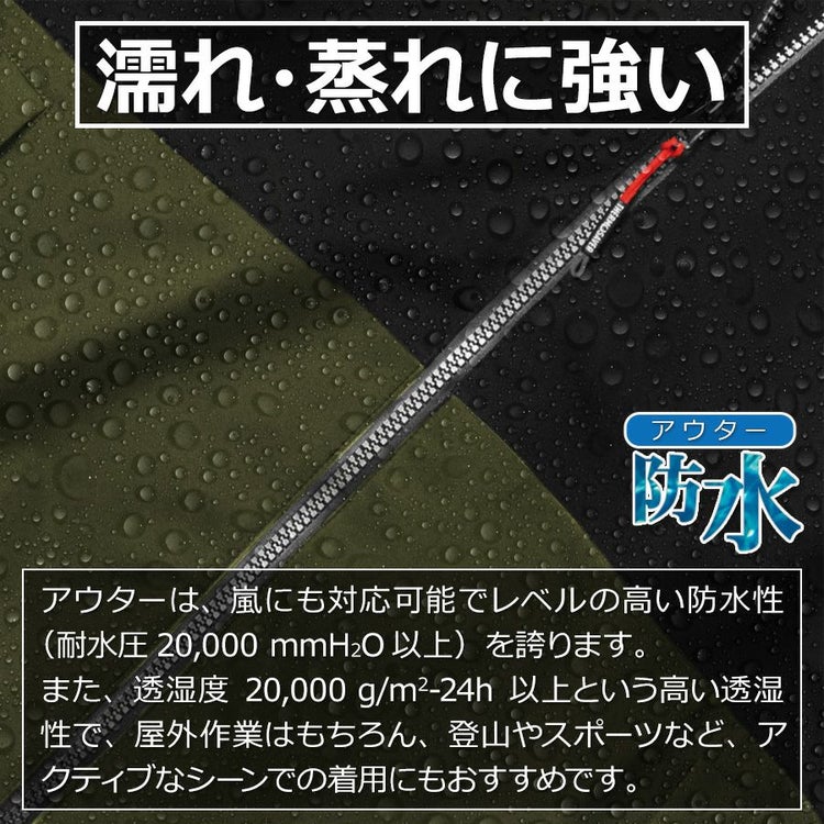 アウターは、嵐にも対応可能なレベルの高い防水性(耐水圧20,000 mmH2O以上)を誇ります。 また、透湿度20,000 g/m2-24h以上という高い透湿性で、屋外作業はもちろん、登山やスポーツなど、アクティブなシーンでの着用にもおすすめです。