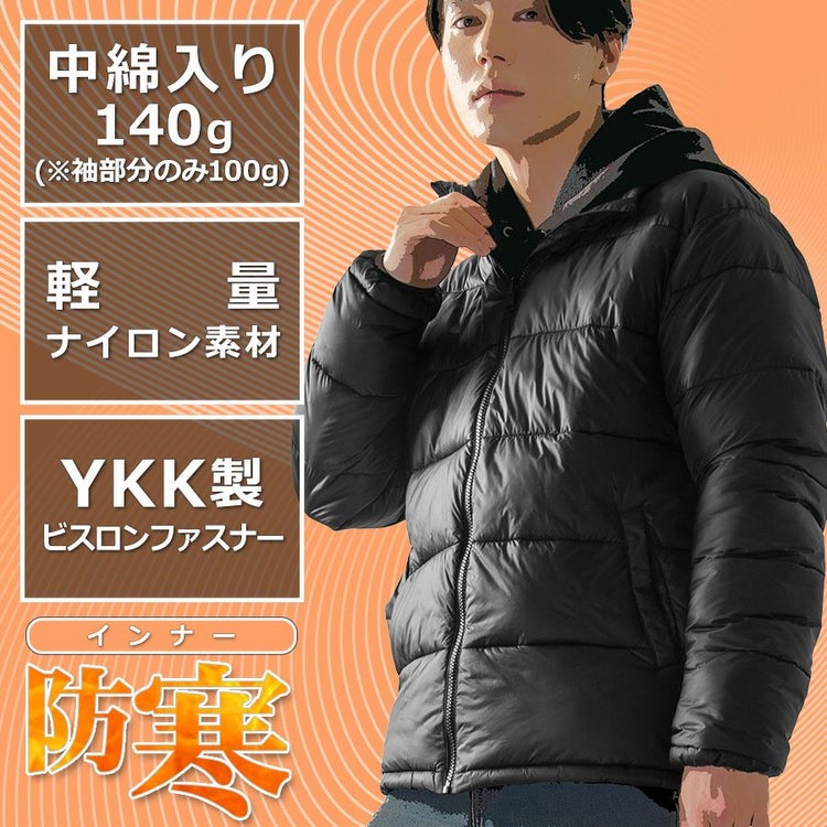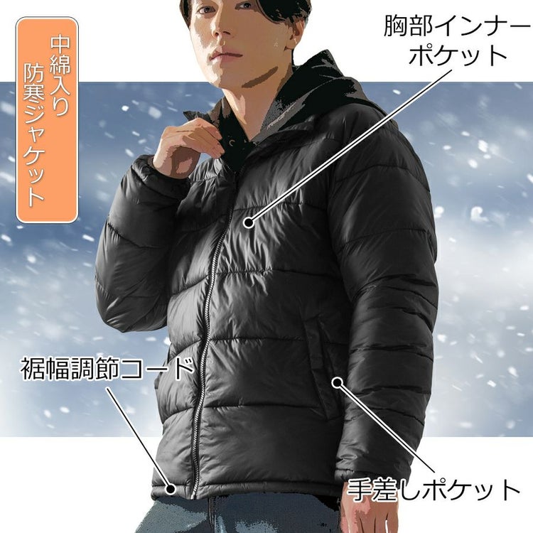 中綿が内部に空気の層を作り、冷たい風が直接体に当たるのを防ぎ、体温を逃さないように工夫しています。